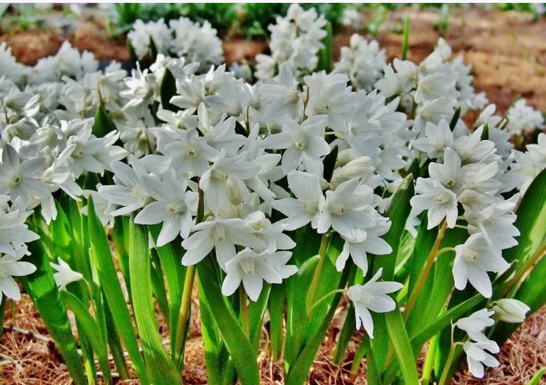 Пушкиния ливанская ‘Alba’ – настоящая жемчужина среди луковичных: крохотные снежно-белые колокольчики с едва заметной голубизной распускаются прямо из компактной зелёной «чаши» листьев. Уже в первых числах весны, как только сходит снег, короткие цветоносы поднимают целые букеты душистых цветов, которые держатся до трёх недель, наполняя воздух лёгким сладким ароматом и привлекая ранних опылителей. После цветения растение сохраняет декоративность благодаря плотной розетке нежно-изумрудной листвы. ‘Alba’ одинаково хорошо чувствует себя и в садовых рабатках, и в балконных ящиках, становясь ярким акцентом любых весенних композиций.