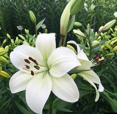 Бутоны начинают окрашиваться через 70–75 суток после появления ростков и радуют примерно две недели. Цветки ориентированы верх-вбок, вытянутые, 17–20 см в диаметре. Бархатисто-белые лепестки немахровые, слегка атласные; коричневые тычинки и бордовые пыльники эффектно контрастируют со снежным фоном.